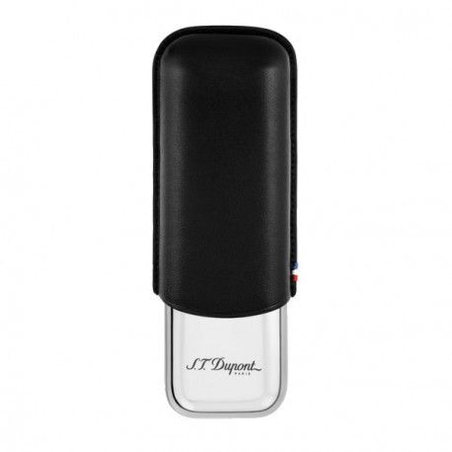 Étui à cigares double en cuir de vachette lisse noir et en acier inoxydable avec logo S.T. Dupont gravé et surpiqûre emblématique rouge, blanc et bleu.